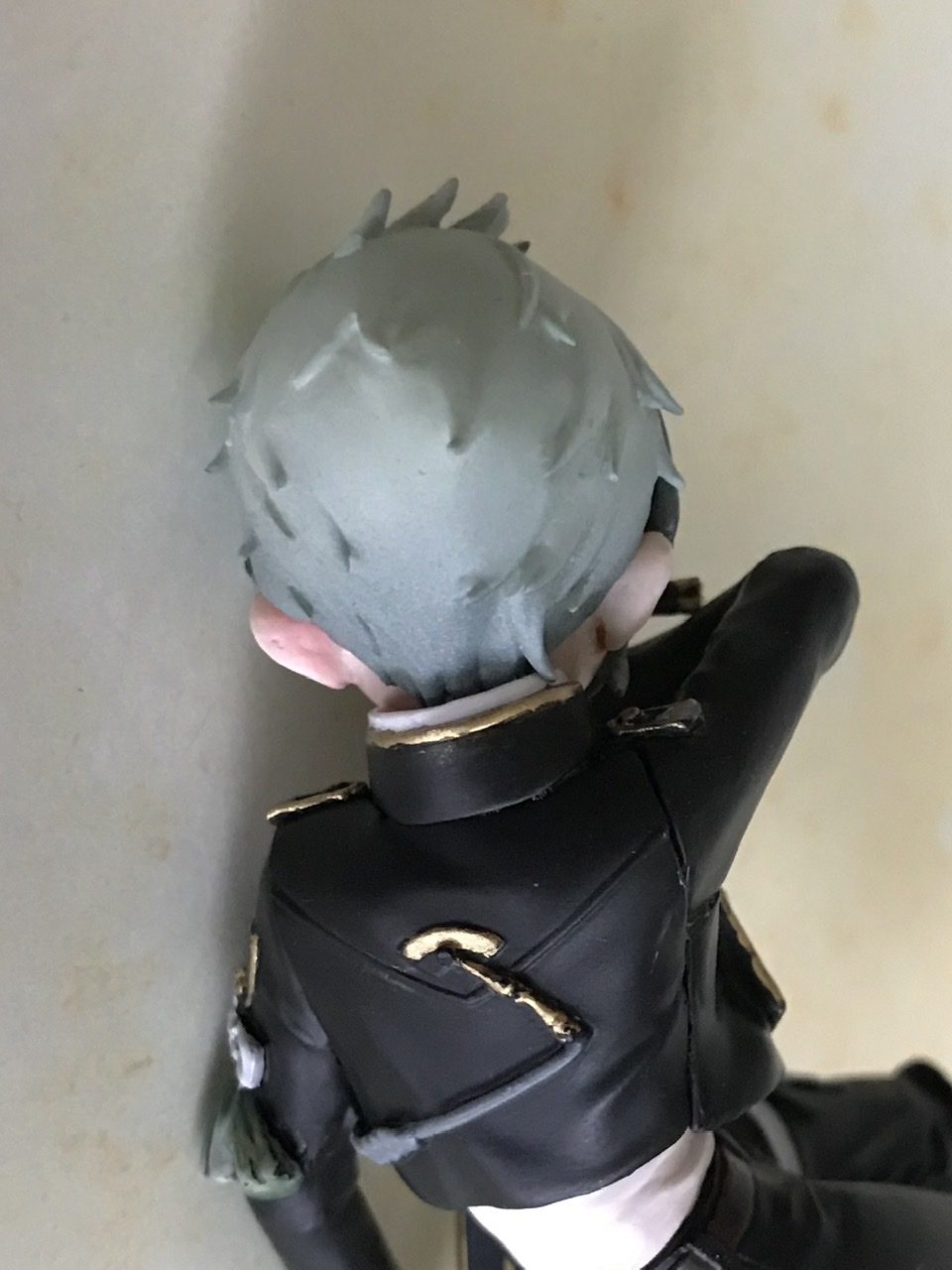 ↑襟足右側の髪は一房だけジャケットの襟にかかっています。